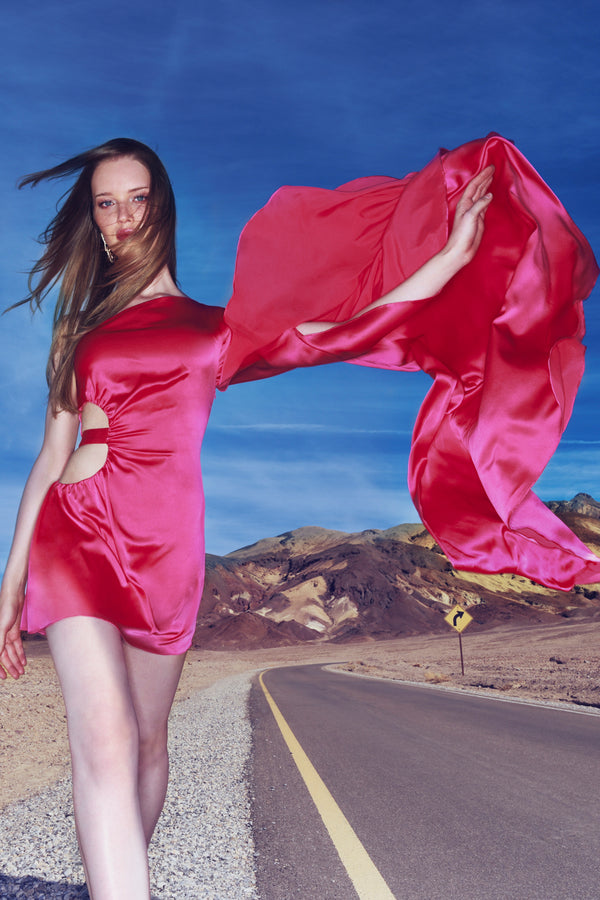 The Malia minidress in air satin is an asymmetric work of art. The exposed right shoulder is echoed in a signature Cult Gaia cutout at the left hip that features a strap for excellent fit. The open shoulder is balanced by a dramatic left sleeve that extends to the floor in flowing splendor. Pair with new Audrey heels to add even more shine to this glimmering masterpiece.Fit NotesFully lined body, unlined sleeve? Side zipper Composition and Care92% Silk 8% Spandex |