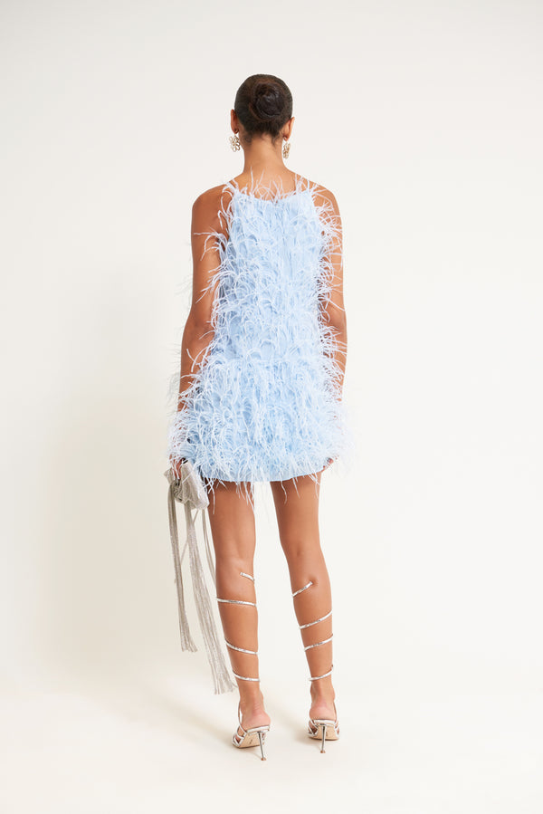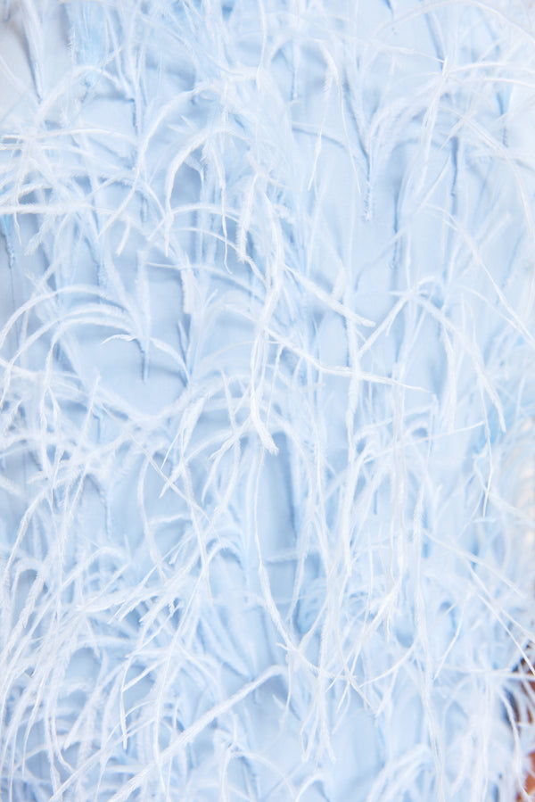 Fit NotesModel is 5'10" and is wearing a size Small Length: 29 1/2" For a longer length, we recommend sizing up Internal strap loop Center back zipper Fully lined Runs true to size Composition and CareBody: 100% Silk Trim: 100% Ostrich Feather |