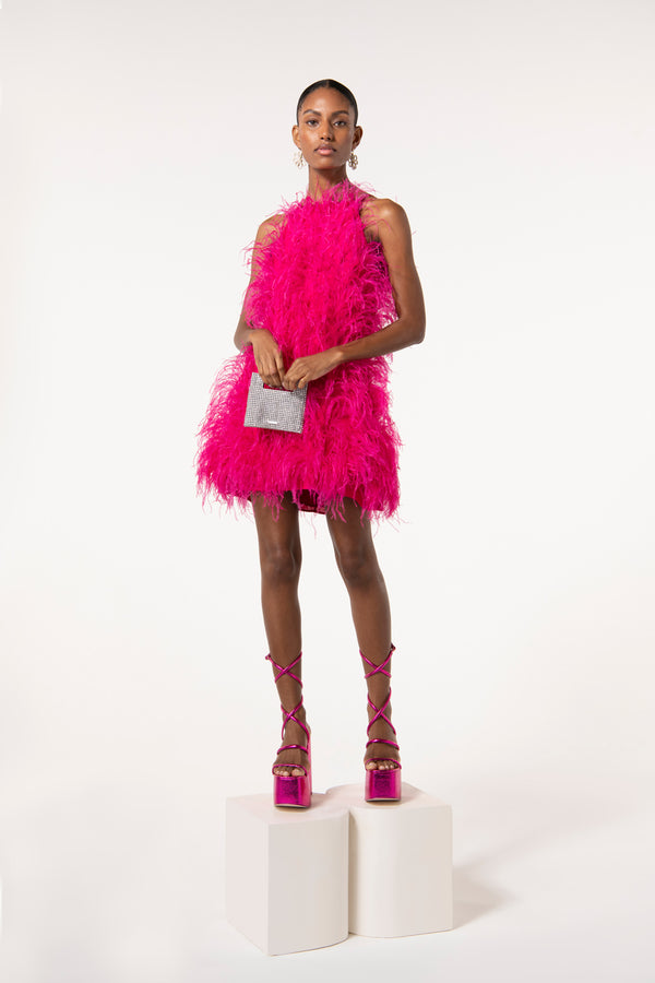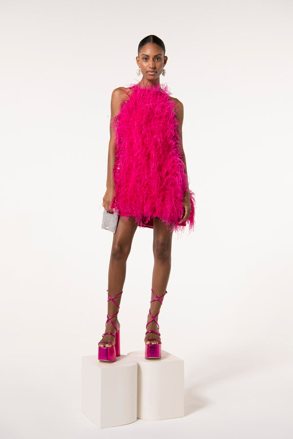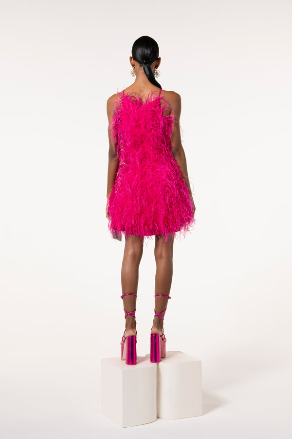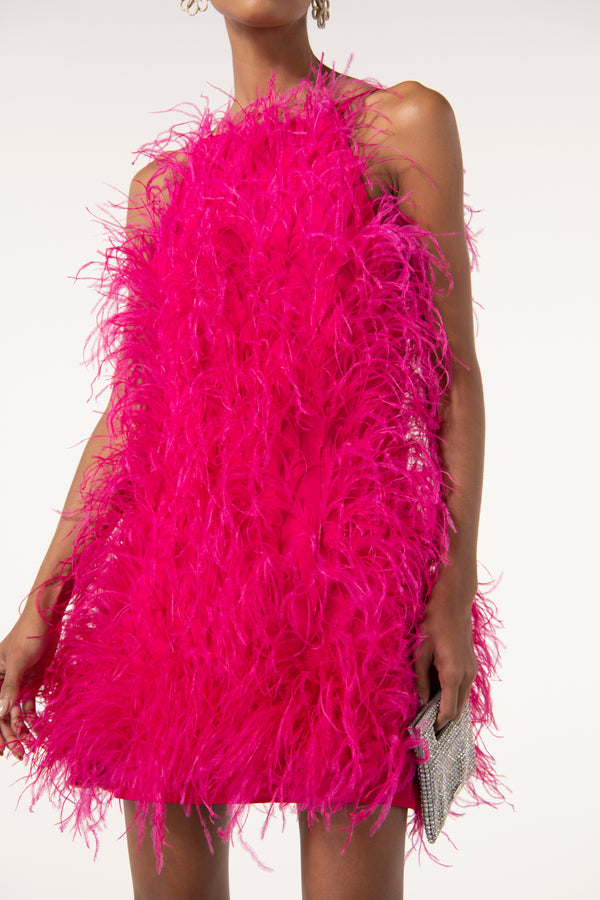 Fit NotesModel is 5'9" and is wearing a size Small For a longer length, we recommend sizing up Internal strap loop Center back zipper Fully lined Runs true to size Composition and CareLength: 29 1/2" Body: 100% Viscose Trim: 100% Ostrich Feather |