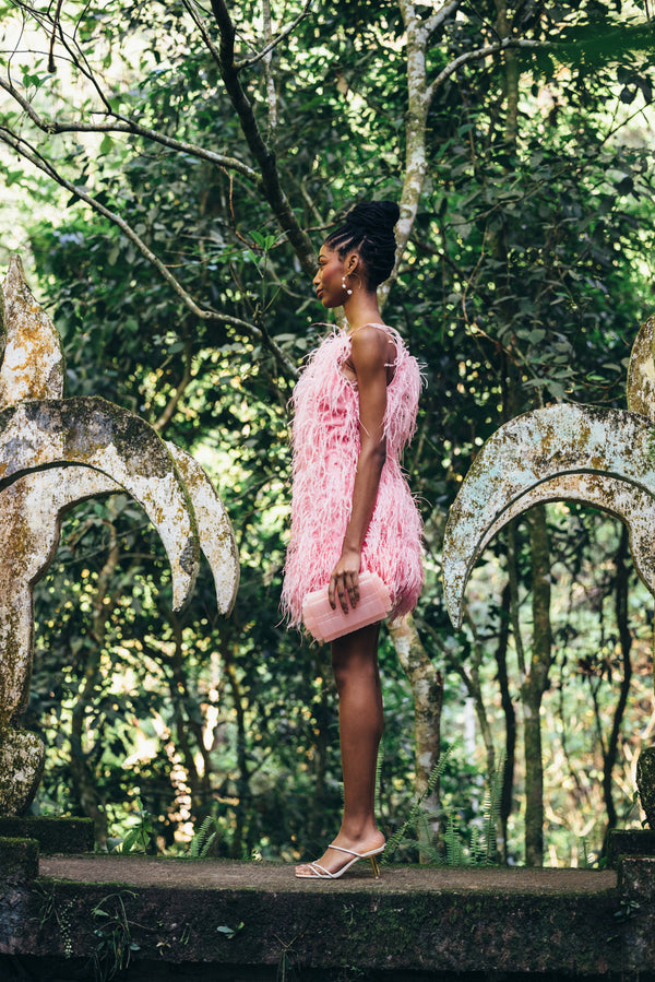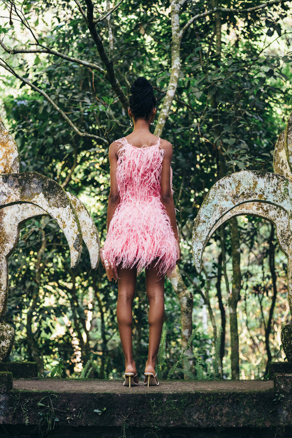 <\/strong> Model is 5'9" and is wearing a size Small Length: 29 1/2" For a longer length, we recommend sizing up Internal strap loop Center back zipper Fully lined Runs true to size Self: 100% Viscose Trim: 100% Ostrich Feather |