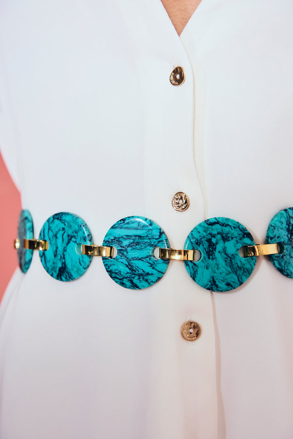 ?Preorder - Estimated Ship Date Between and February 20th and March 6th<\/b><\/span><\/p>\n Crafted with a series of turquoise-toned disks linked with gold-toned rings, the Gabrie Belt is our new favorite accessory. The gold tones make the turquoise tones pop-out even more, especially against a constrasting-hued dress or pant. Adjustable and guaranteed to add a touch of color to your outfit.<\/p> Adjustable chain? Imitation turquoise Toggle closure? 1.70" x 43.00" 100% Resin TRIM: 100% Brass |