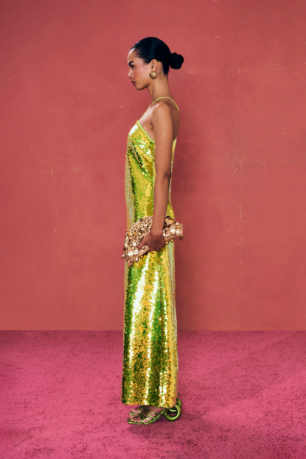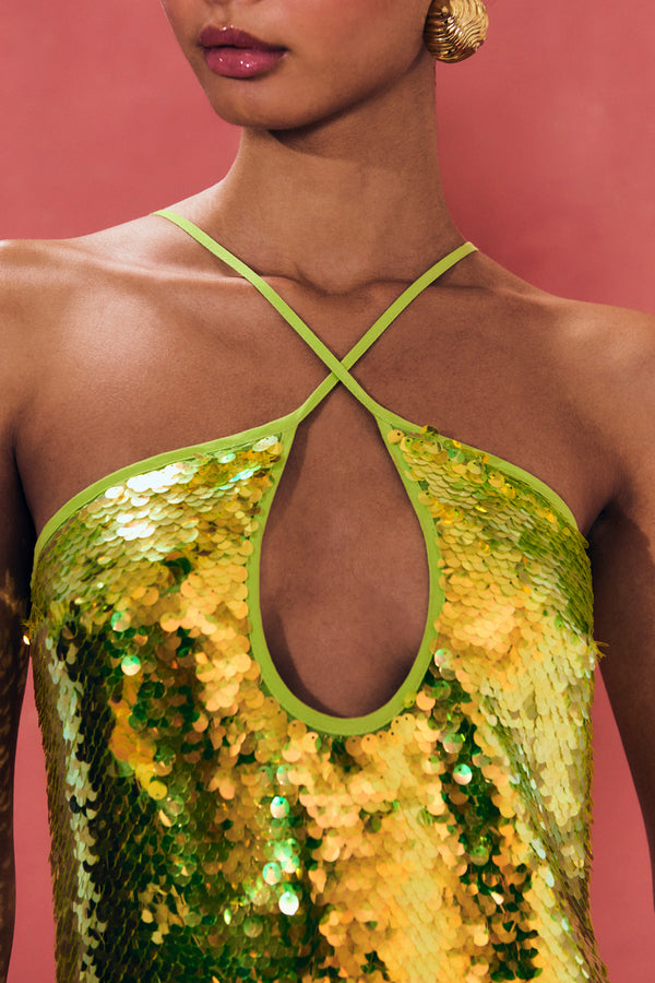 Lily is an ankle-length halter dress that features a signature Cult Gaia keyhole cutout at the bust made from crisscrossing, thin, adjustable strapping. Acid-green paillettes are overlaid to create ultimate shine and movement. The bright and playful color gives multi-dimensional glimmer that will have all eyes on you.Fit NotesLayered iridescent sequins Fully lined? Front neck line crosses over? Adjustable straps? Composition and Care100% Polyester |