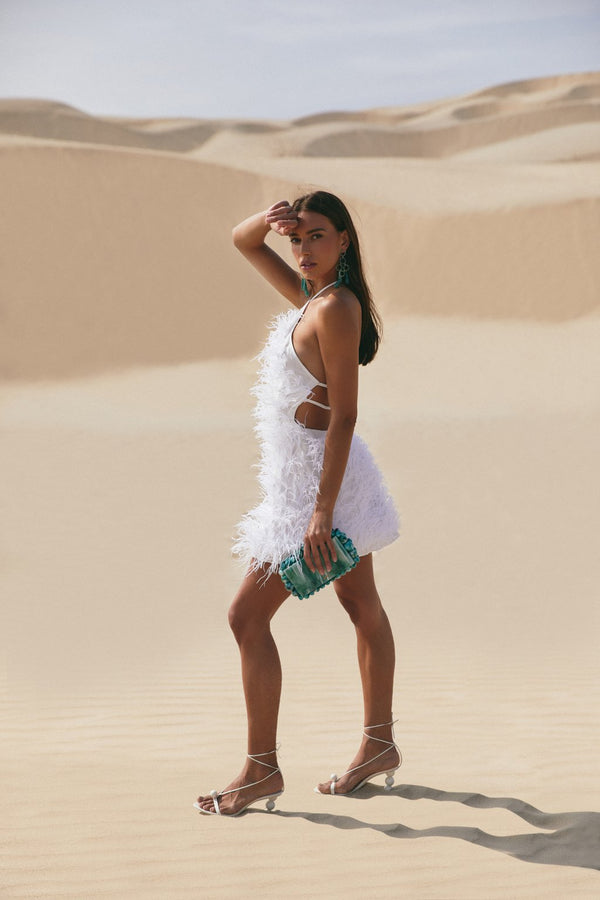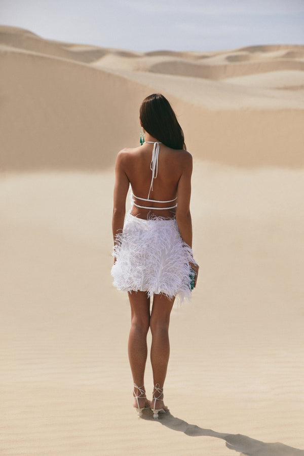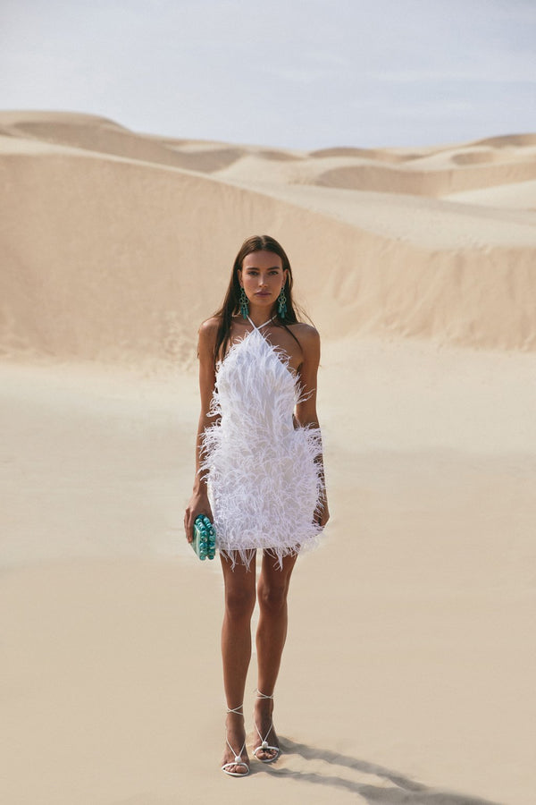 Fit NotesWe recommend sizing up if curvier and sizing down if petite as the torso of this style is quite long Dry clean only Composition and CareBody: 100% Viscose Trim: 100% Ostrich Feather Model is 5'11" and wearing size Small |