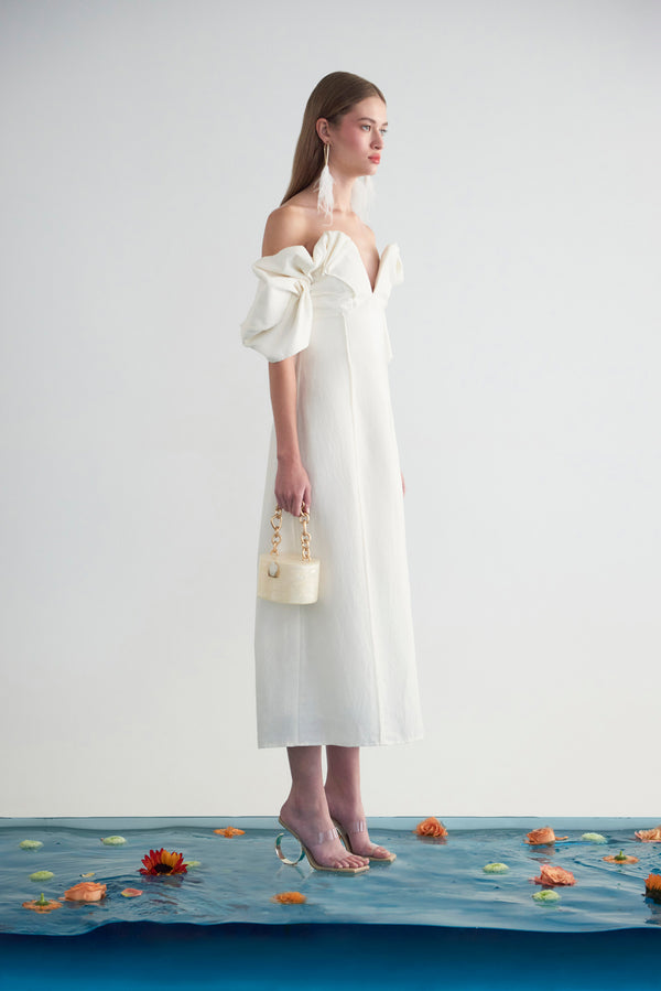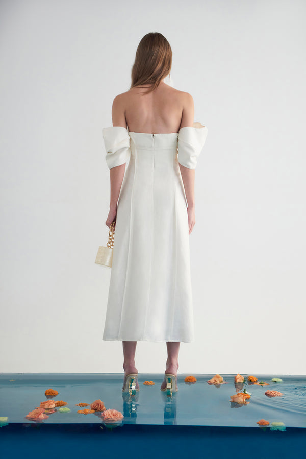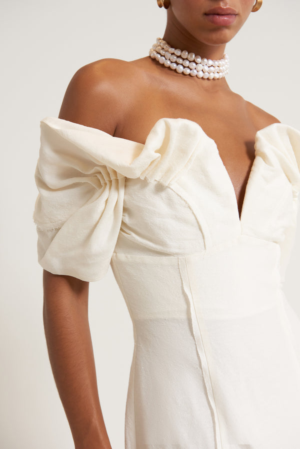 <\/strong> Model is 5'11" and is wearing a size Small Length: 46 1/2" Off-the-shoulder Lined from the waist up? Boning structured detail at bust Exaggerated Sleeves Slit detail at sides Raw edged hem Designed to be snug in bust Invisible zipper at back V-wire at bust Padding at sleeves for structure Runs slightly smaller - we recommend sizing up Body: 17% Silk, 20% Rayon, 25% Wool, 38% Linen Lining: 100% Cotton |
