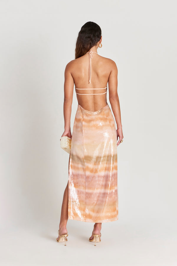 <\/strong><\/strong> Model is 5'10.5" and is wearing a size Small Length: 50 1/4" Adjustable halter neck Fully lined Double elastic strap at back Side slit For a larger bust, we recommend sizing down 100% Polyester |