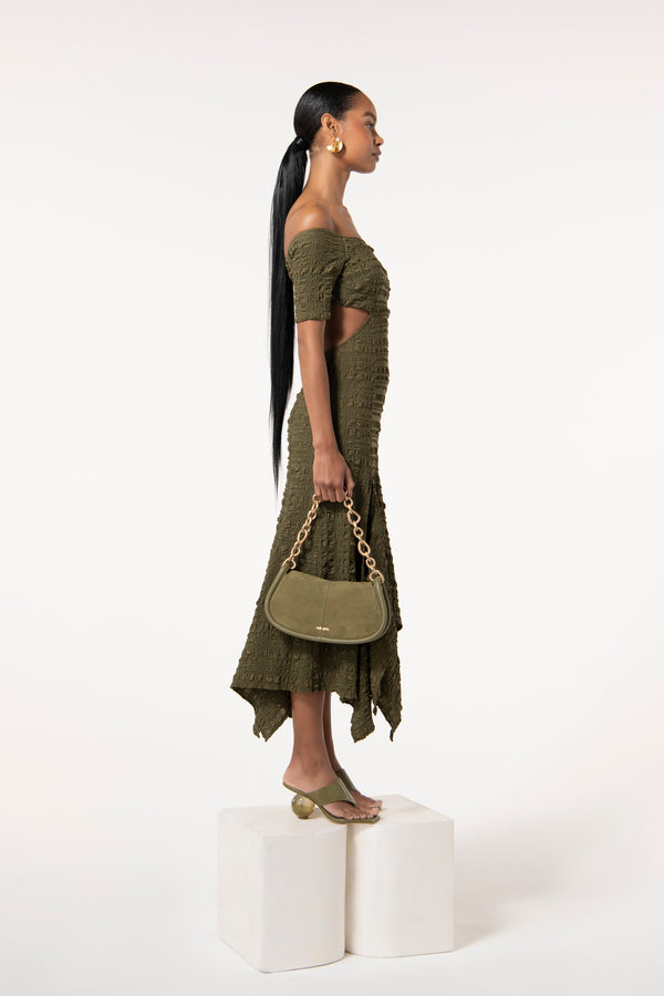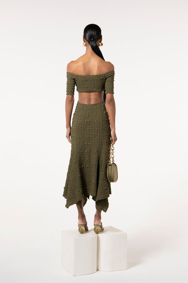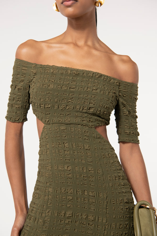 Fit NotesModel is 5'9" and is wearing a size Small Off the shoulder Lined bodice Stretchy fit Center back zipper Open back Running small; we recommend sizing up Composition and Care64% Polyester, 32% Polyamid, 4% Elastane |