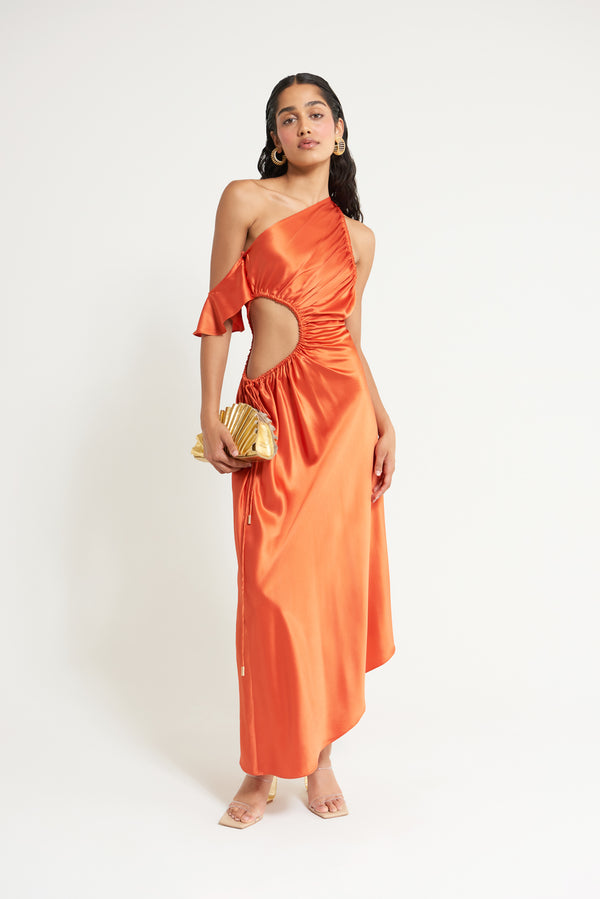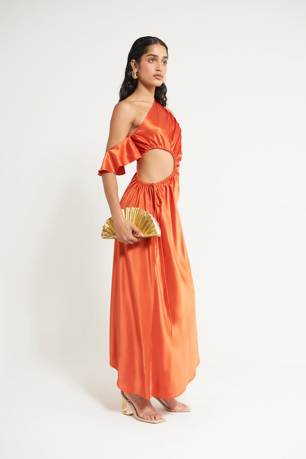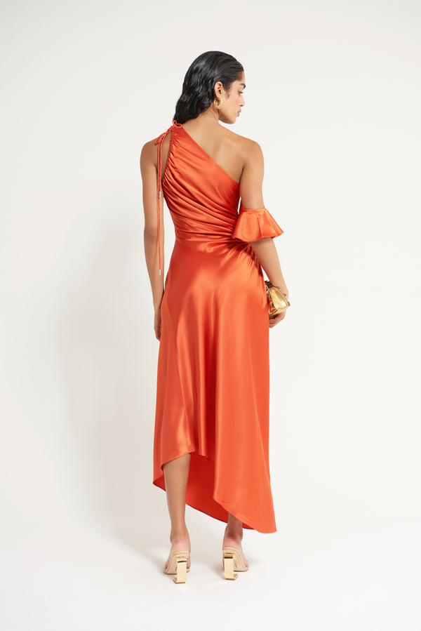 Fit NotesModel is 5'9" and is wearing a size Small Removable sleeve with button Adjustable cutout at side waist Adjustable neckline Fitted in waist with relaxed fitting skirt Ankle-length Bias cut Invisible side zipper Composition and Care79% Naia Acetate, 21% Polyester |