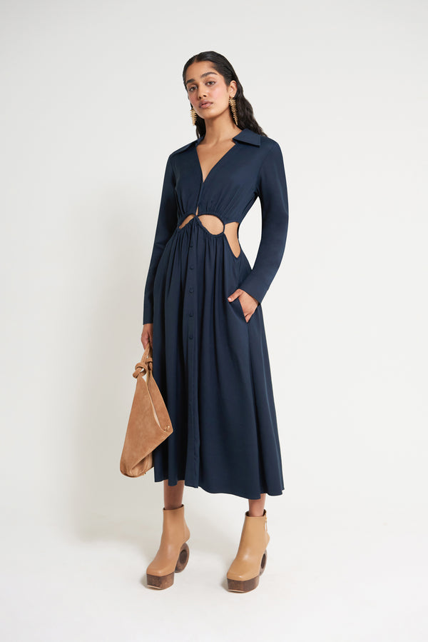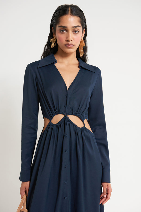 Fit NotesModel is 5'9" and is wearing a size Small Stretchy Cutout detail at waist Functional center front buttons Unlined Composition and Care100% Rayon Steaming recommended before wear |