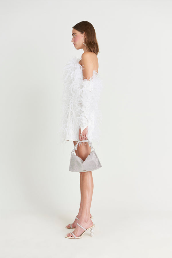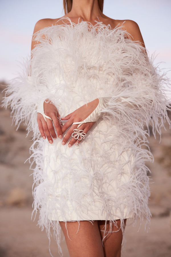 Fit NotesModel is 5'9" and is wearing a size Small Invisible side zipper Unlined Gel tape at bust Boning at bodice Composition and CareBody: 97% Nylon, 3% Lycra Trim: 100% Ostrich Feather |