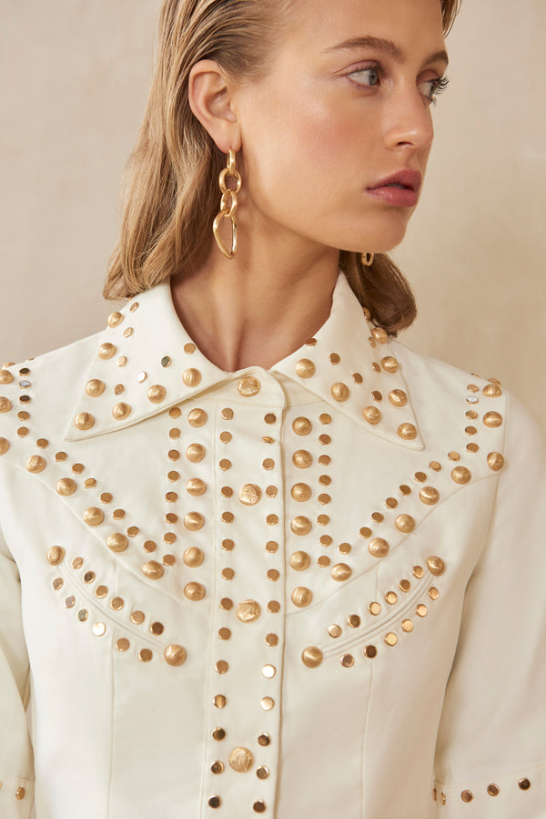 <\/strong> Fit Notes Front snap closure?Various stud sizes throughoutFitted mini dressFully lined? Composition and Care 98% Cotton 2% Lycra