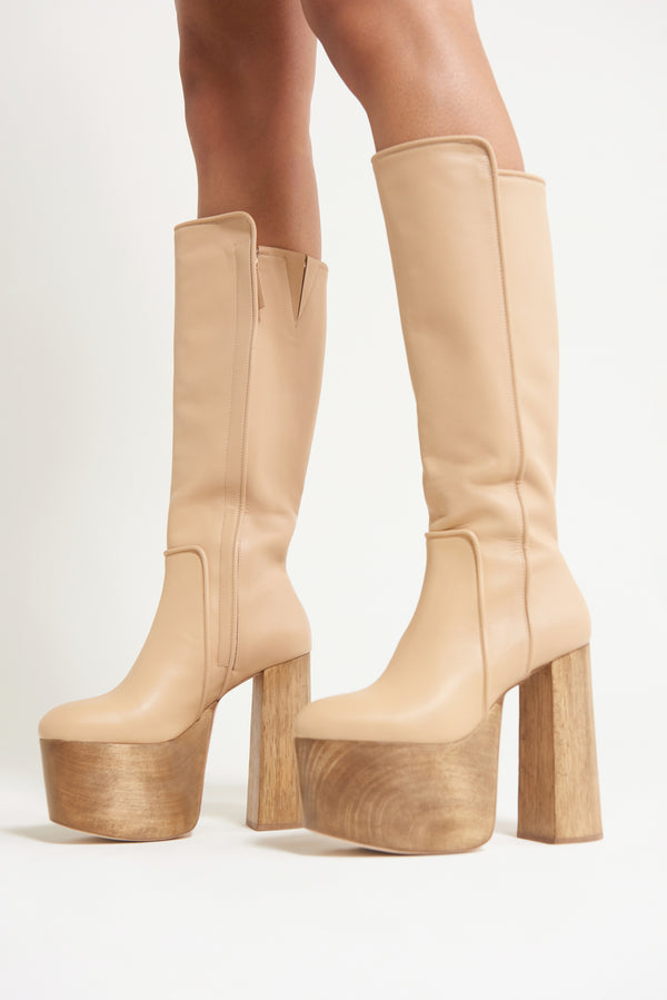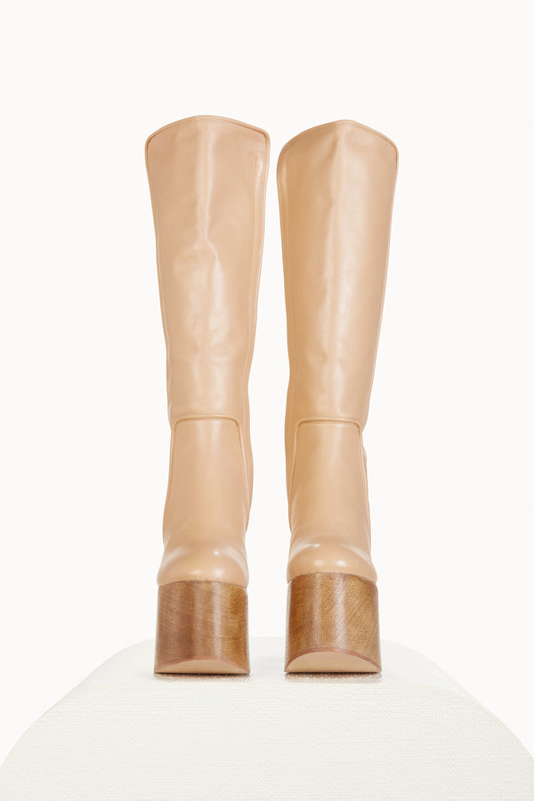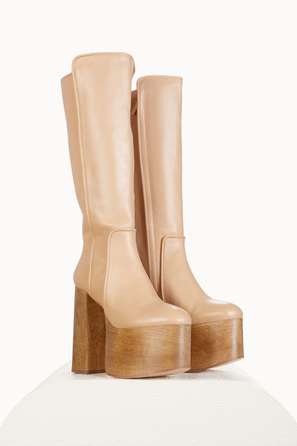 Fit NotesHand-carved heel Zipper at interior Leather panel detail Composition and CareHeel height: 3.75" Boot shaft height: 14" Platform height: 2" Body: 100% Cow Leather Sole: 100% Rubber Heel: 100% Wood |