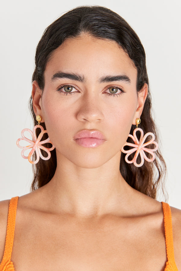This floral-inspired earring set is made with tubular acrylic shaped into graceful flower petals that radiate from the center. A tiny brass loop connects the earring to a small, comfortable post with ball back closure to keep strain from your ears while wearing. A unique sculptural piece, the Blossom Earring is meant to make a statement.<\/p> Fit NotesPost earring Ball-back closure Acrylic tubing Petals are not adjustable Composition and CareLength: 2.56" Body: 100% Acrylic Trim: 100% Brass |