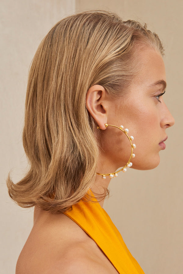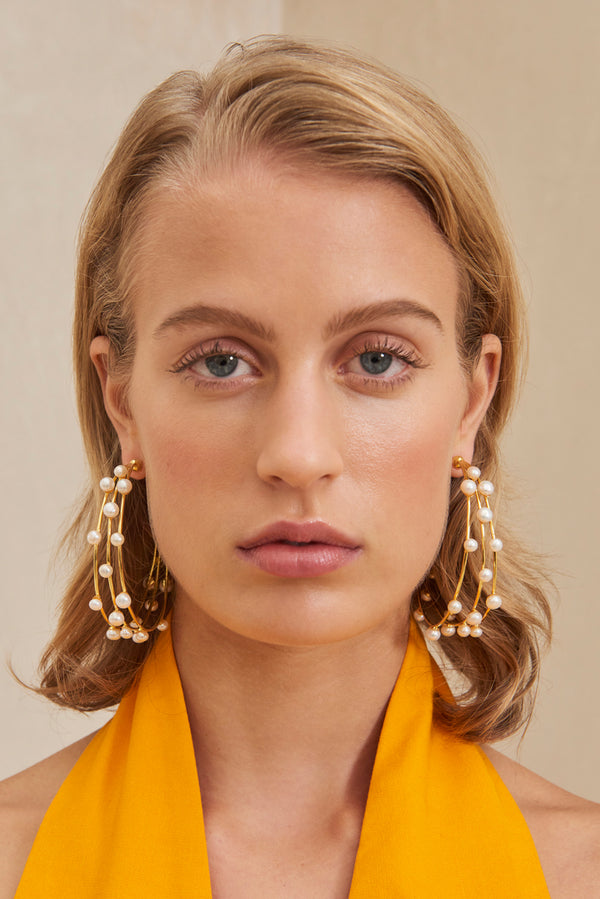 Shanti is a set of gorgeous earrings that are sure to stun with their gold-toned, brushed brass frame embellished with real Baroque pears. Guaranteed to light up the room and complete your outfit.Fit NotesReal pearl? Ball back closure Composition and Care1.02" x 2.80" 100% Brass TRIM: 100% Imitation Pearl? |