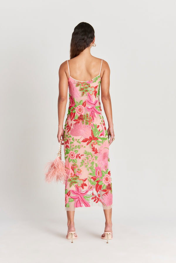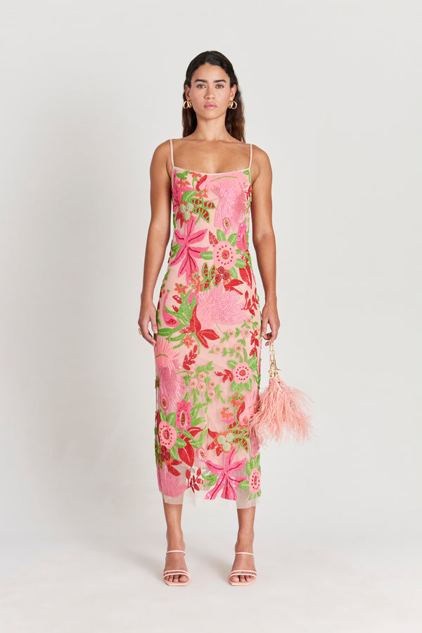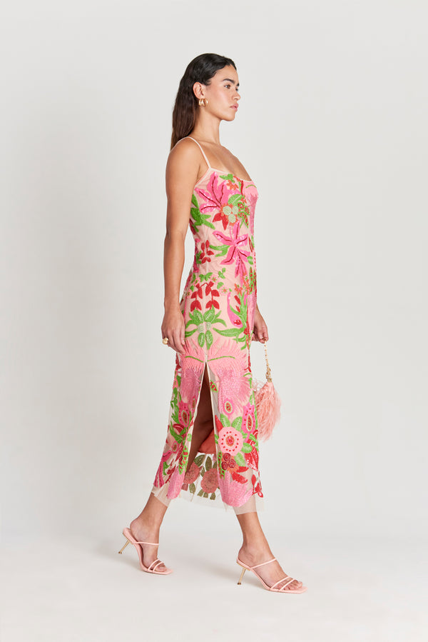 Fit NotesModel is 5'10.5" and is wearing a size Small Non-adjustable spaghetti straps Invisible side zipper Slip dress at interior Side slits Raw edge hem Composition and Care100% Polyester |