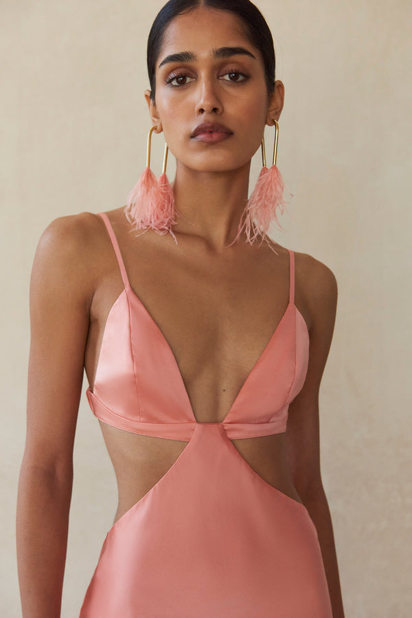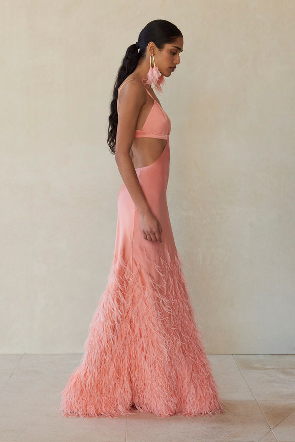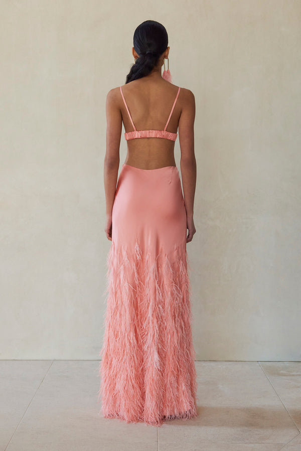 Fit NotesModel is 5'10.5" and is wearing a size Small Spaghetti straps Elastic at waist Center back hook and eye closure at bust Center back zipper at skirt Fully lined For more coverage, we recommend sizing up Composition and CareBody: 100% Silk Satin Lining: 100% Polyester Embroidery, 100% Ostrich Feather |