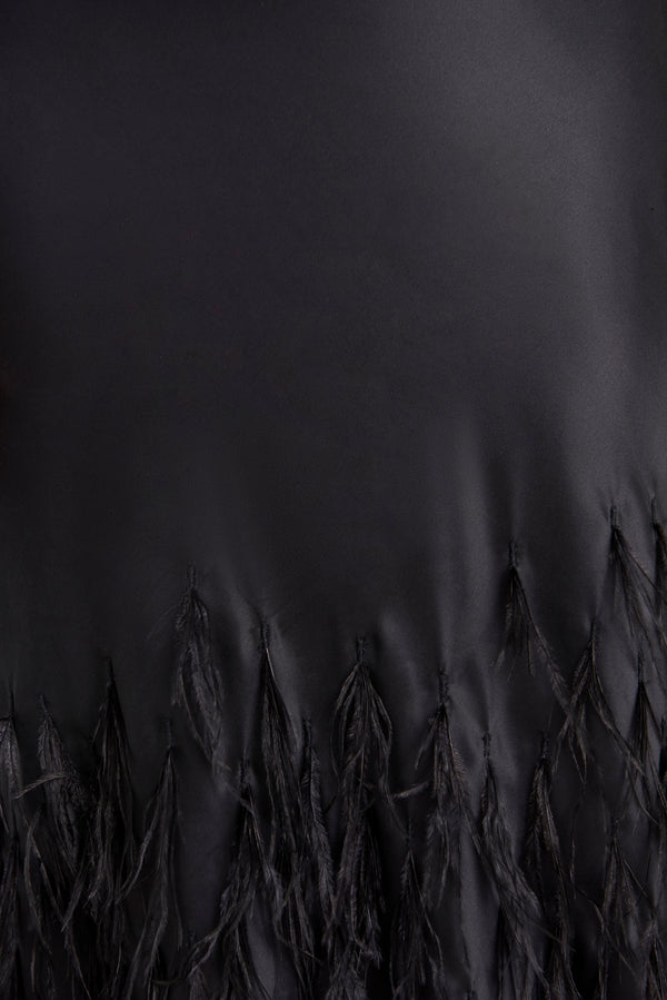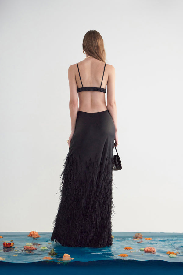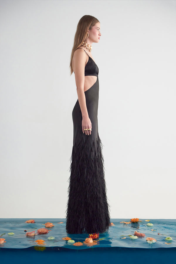 Fit NotesModel is 5'9" and is wearing a size Small Length: 61 1/2" Spaghetti Straps Elastic at waist Center back hook and eye closure at bust Center back zipper at skirt Fully lined For more coverage, we recommend sizing up Composition and CareBody: 100% Silk Satin Lining: 100% Polyester Embroidery: 100% Ostrich Feather |