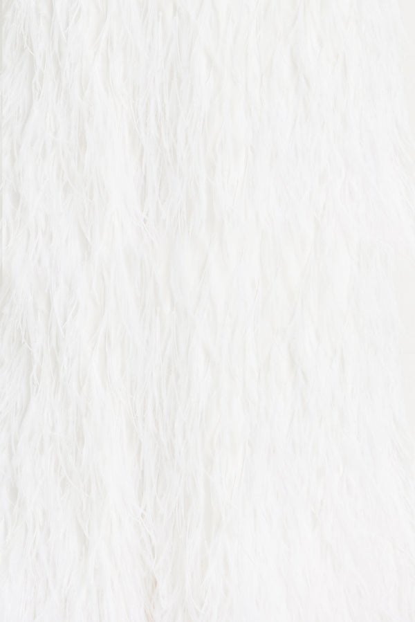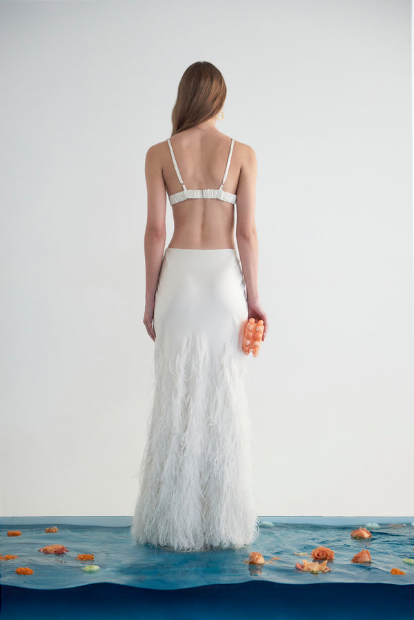 <\/strong> Model is 5'10" and is wearing a size Small Length: 61 1/2" Spaghetti straps Elastic at waist Center back hook and eye closure at bust Center back zipper at skirt Fully lined For more coverage, we recommend sizing up Body: 100% Silk Satin Lining: 100% Polyester Embroidery: 100% Ostrich Feather |