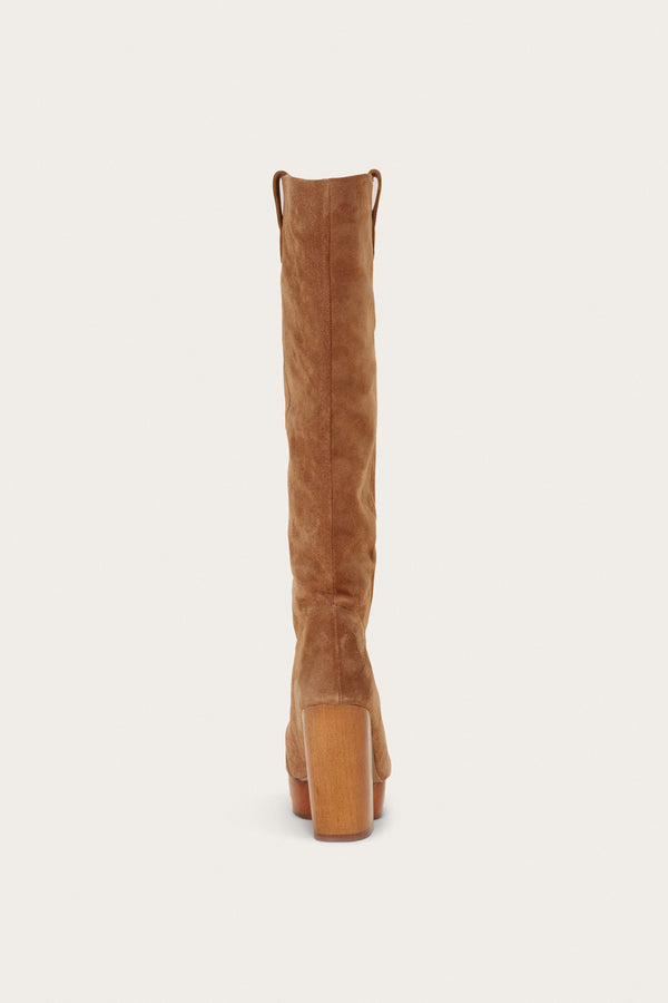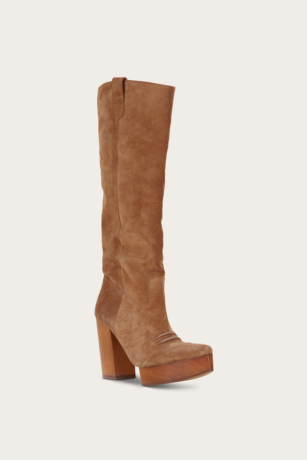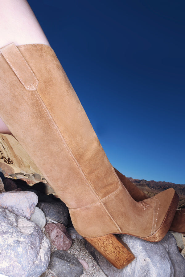?Preorder - Estimated Ship Date Between March 8th and March 22nd<\/b><\/span><\/p>\n Make and entrance with Mishka. This towering take on a classic, western silhouette will give you lift. The Camel-colored velour suede compliments the wooden heel and is adorned with stitch detailing. Two loops at the top allow for easy fit. Ultra-walkable. Make them stare with Mishka.<\/p> Heel: 4.5"? UPPER: 100% Cow Leather SOLE: 100% Rubber HEEL: 100% Wood |