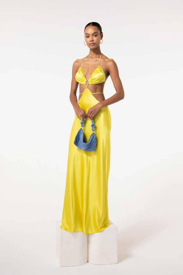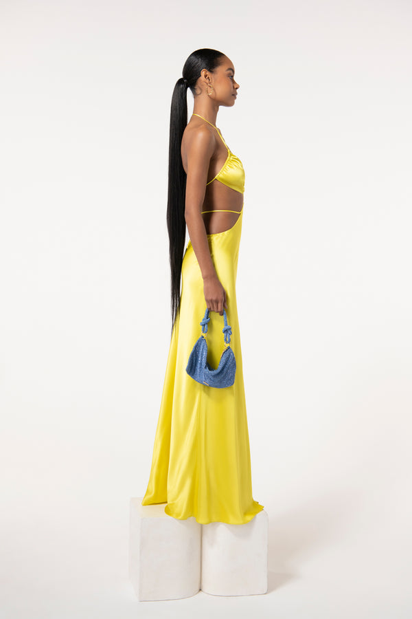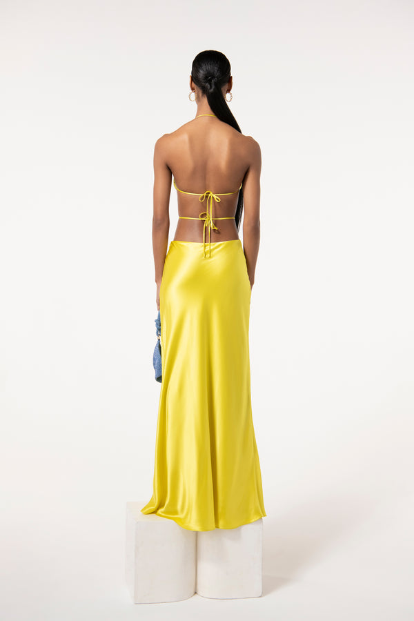 Fit NotesModel is 5'9" and is wearing a size Small Fully lined Adjustable string straps Ties in back Halter dress Waist strap Invisible side zipper Adjustable bra cups Composition and Care79% Naia Acetate, 21% Polyester |