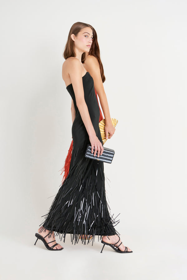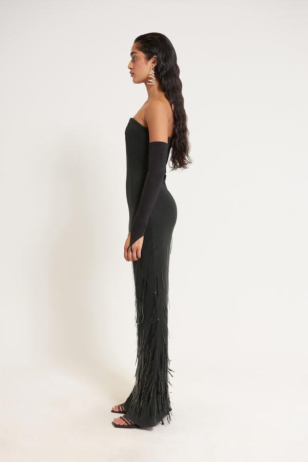 Fit NotesModel is 5'9" and is wearing a size Small Invisible side zipper Boning at bodice Strapless Lined at bust Gel tape at bust Gloves not included Composition and Care100% Silk |