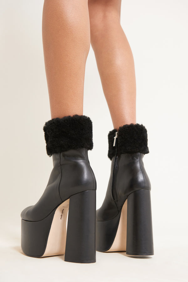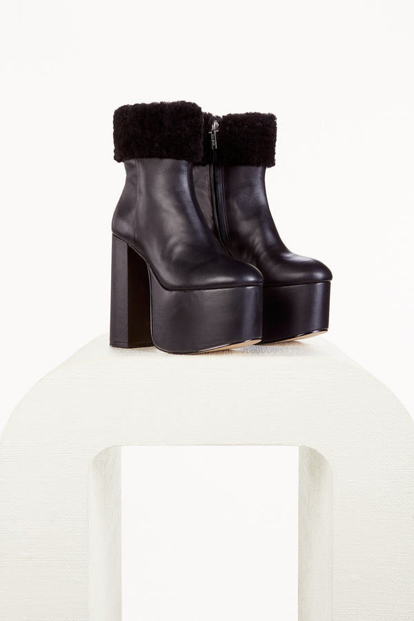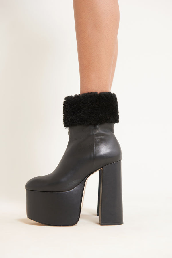 Fit NotesShearling imported from Italy Fur at cuff Comfortable fit Side zipper Composition and CareHeel height: 5.75" Boot shaft height: 6" Body: 100% Cow Leather, 100% Shearling Sole: 100% Rubber Heel: 100% ABS |