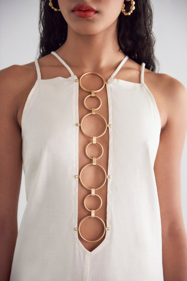 Fit NotesModel is 5'9" and is wearing a size Small Center back zipper Lined Brushed brass metal rings High neckline Easy fitting Not adjustable Composition and Care51% Linen, 47% Rayon, 2% Spandex |