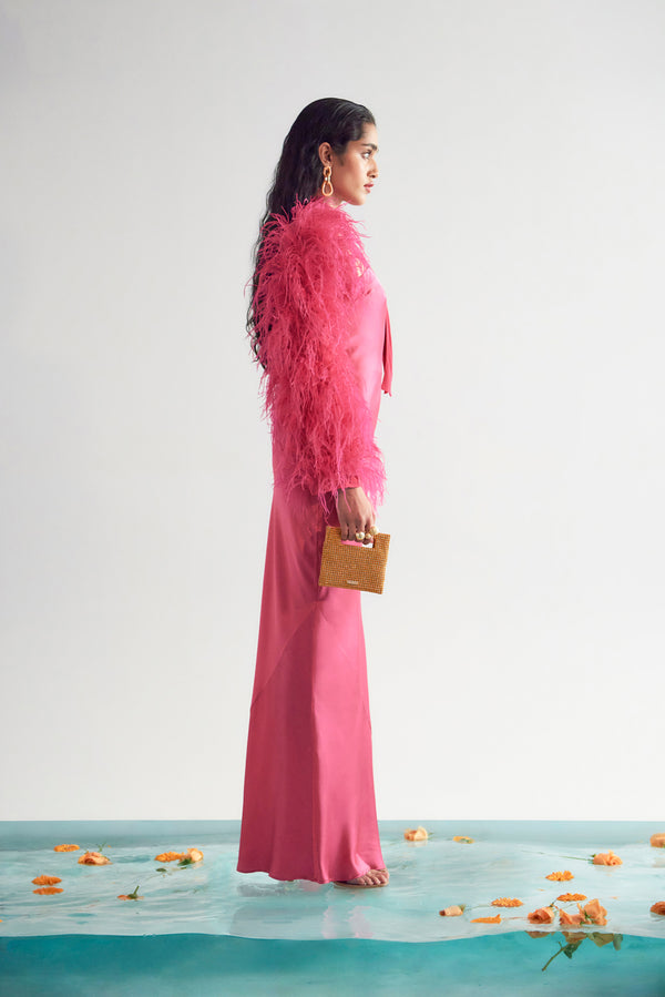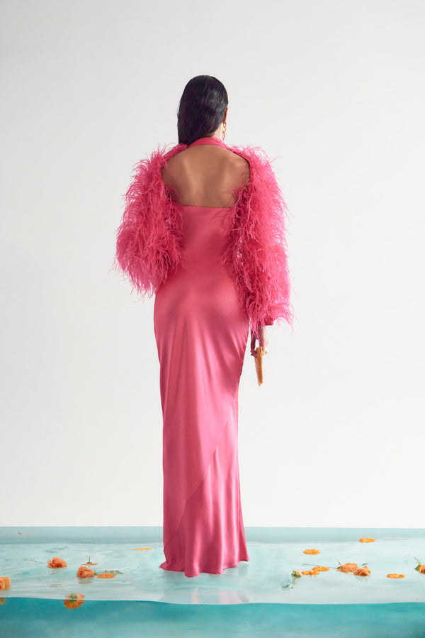 Model is 5'7" and is wearing a size Small Ties at neck Can be worn front or back Fully lined Loose-fitting sleeve with low armhole Body: 100% Viscose Trim: 100% Ostrich |