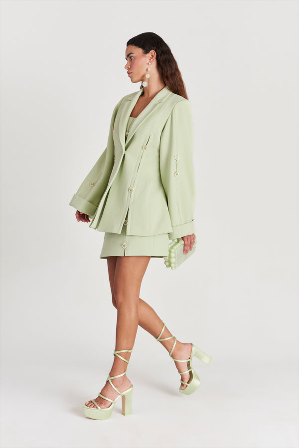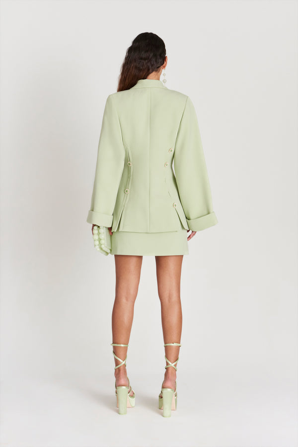 Fit NotesModel is 5'10.5" and is wearing a size Small Oversized fit Small slit cutouts with floral embellishment Lined Center front buttons Composition and Care64% Polyester, 27% Viscose, 9% Elastane |