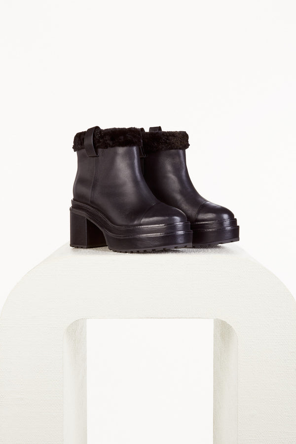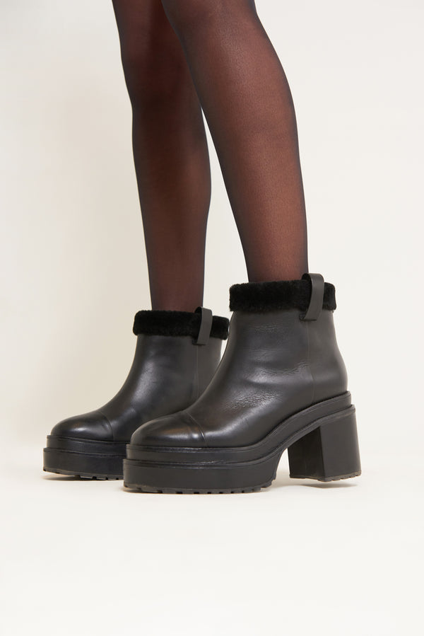 Fit NotesItalian leather shearling trim Padded sole Pull-on style Composition and CareHeel height: 3" Boot height shaft: 5" Body: 100% Cow Leather, 100% Shearling Sole: 100% Rubber Heel: 100% ABS |