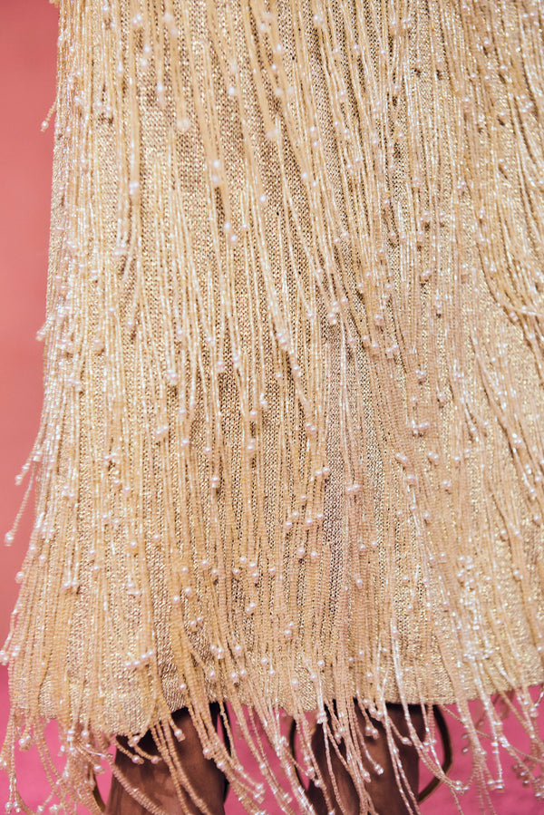 The draping beauty of the Zion Gown cannot be denied. The halter neckline leaves the shoulders exposed, with a body skimming fit, created by adjustable ties that cross over the back and come together to create a signature Cult Gaia cutout. The metallic fringe yarn gives a touch of light gold sparkle and elegant movement to this gown, that will light up the room and have all eyes on you. Tips of the delicate fringe are adorned with luxurious pearls. The ankle-length hemline is exaggerated by the fringe and the dress is every so slightly semi-sheer.Fit NotesHand embroidered Tie back? Low open back? Heavy material? Composition and Care42% Metallic 58% Nylon |
