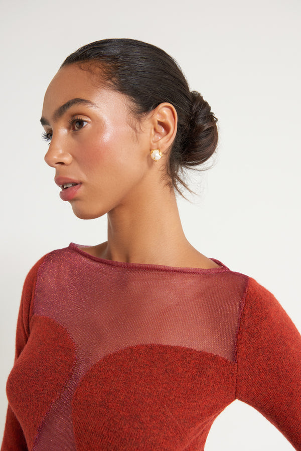 Fit NotesModel is 5'10" and is wearing a size Small Sheer paneling at bodice with opaque bust coverage Boat neck Fragile; do not snag Composition and Care6% Wool, 68% Acrylic, 12% Polyester, 11% Nylon, 3% Spandex |