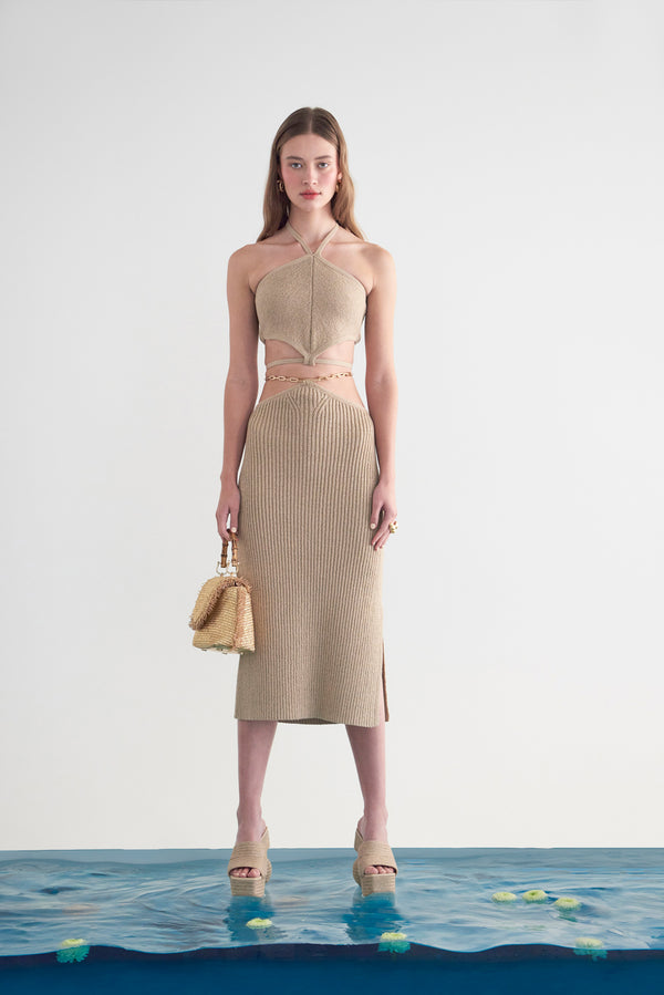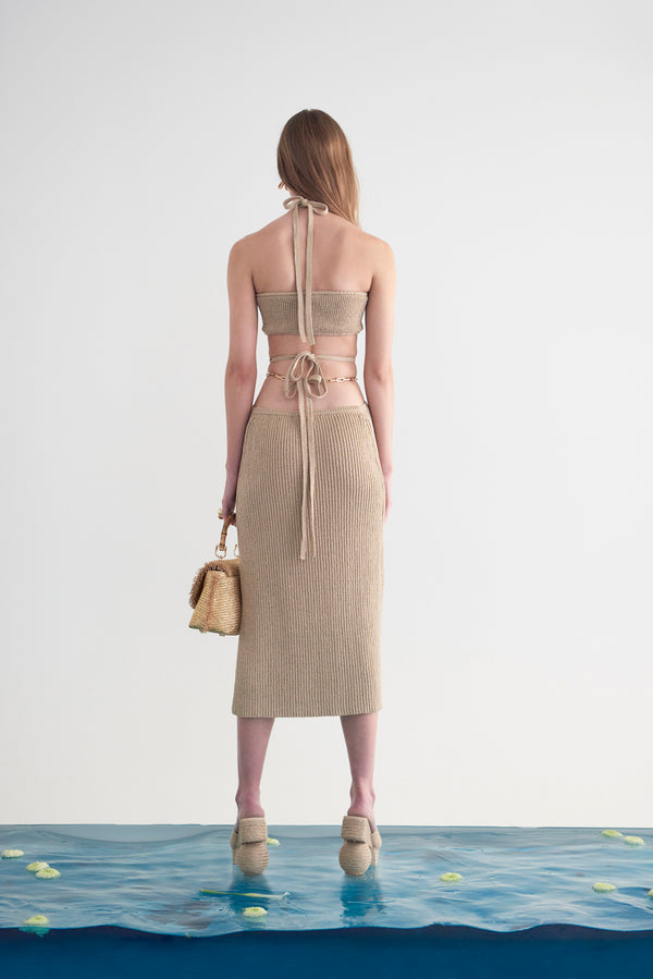 Fit NotesModel is 5'8" and is wearing a size Small Cropped Halter neck style Adjustable waist and neck ties Unlined Stretchy knit Composition and Care77% Cotton, 23% Polyester |