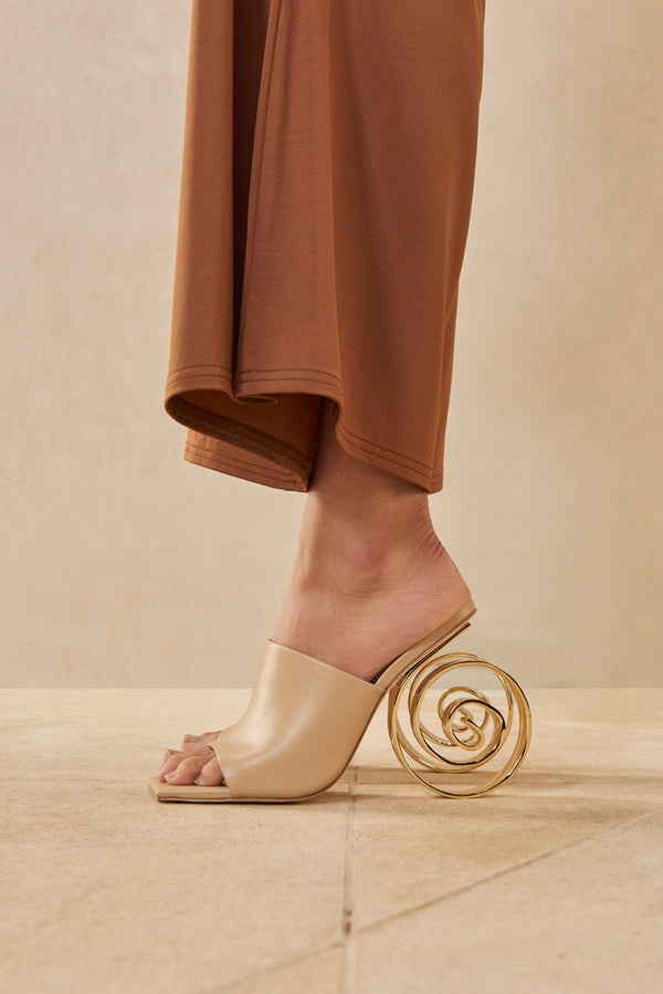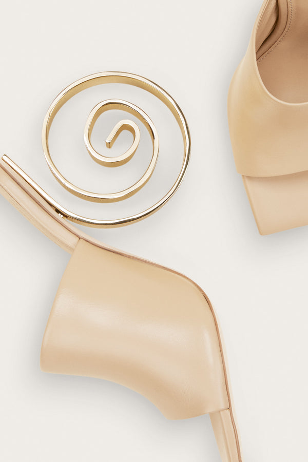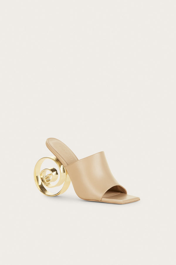 ?Preorder - Estimated Ship Date Between February 21st and March 7th<\/b><\/span><\/p>\n A work of art. The slightly oversized spiral heel is a sculptural touch and shimmers in gold-toned, brushed brass. The thick strap over the foot is crafted in a neutral-hued nappa leather. The Ira Mule will be your go to.<\/p> Heel: 4.25" UPPER: 100% Cow Leather SOLE: 100% Buff Leather HEEL: 100% Steel |