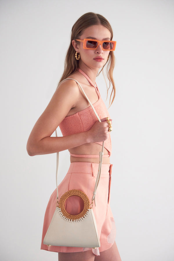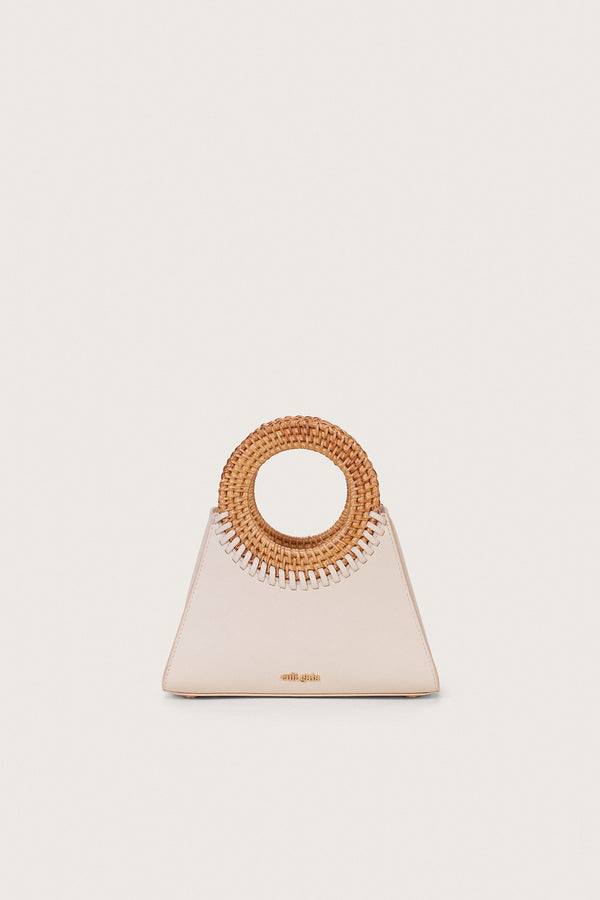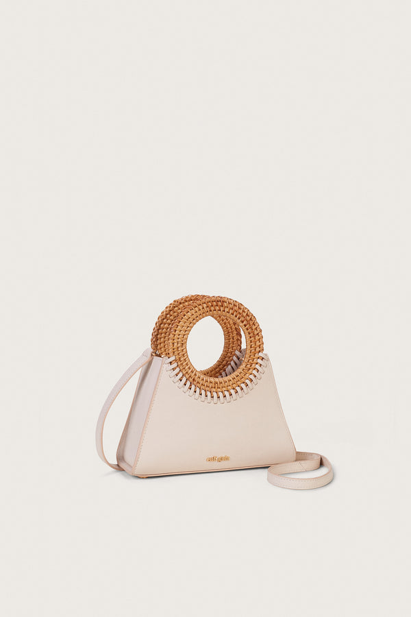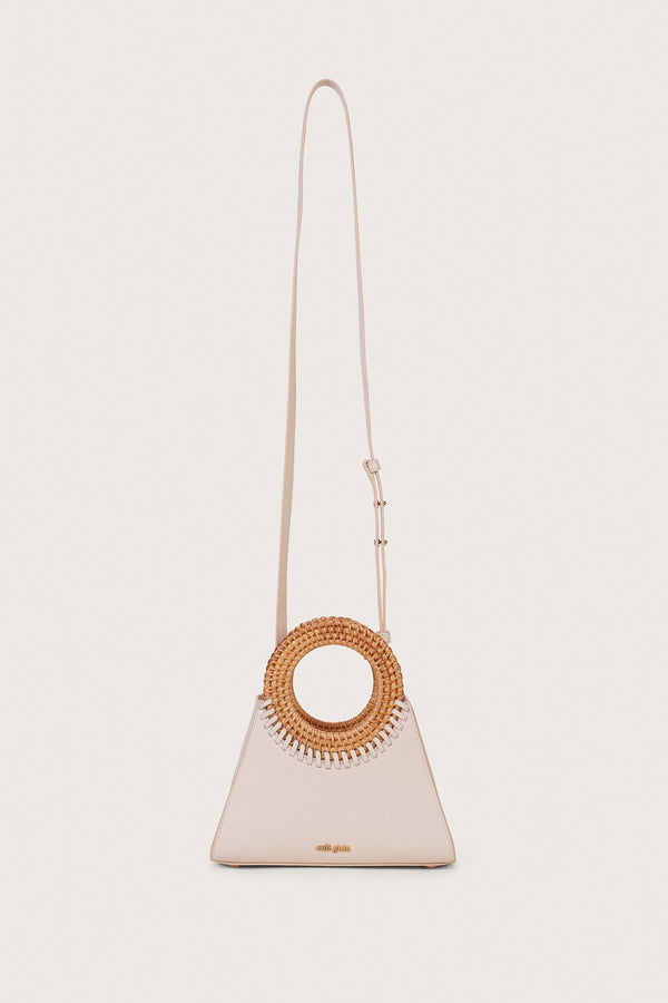 Fit NotesRemovable crossbody strap Feet on bottom Can fit a small phone, wallet, keys, etc. Composition and Care2.95" x 5.71" x 8.5" Body: 100% Cow Leather Trim: 100% Rattan Lining: 90% Polyester, 10% Polyurethane |