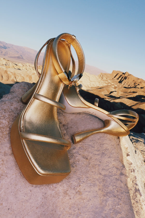 ?Preorder - Estimated Ship Date Between March 8th and March 22nd<\/b><\/span><\/p>\n A work of art. Designed in a shimmering metallic gold nappa leather, Elodie will give you lift and style. Her strapping and platform sole is complimented by moire textured gold-toned metal closure details on the adjustable ankle strap, while her heel has a sculptural shape that draws attention.<\/p> Middle strap for extra security? Custom hardware closure? True to size Heel: 5.5" UPPER: 100% Cow Leather SOLE: 100% Reconstituted Leather HEEL: 100% ABS |