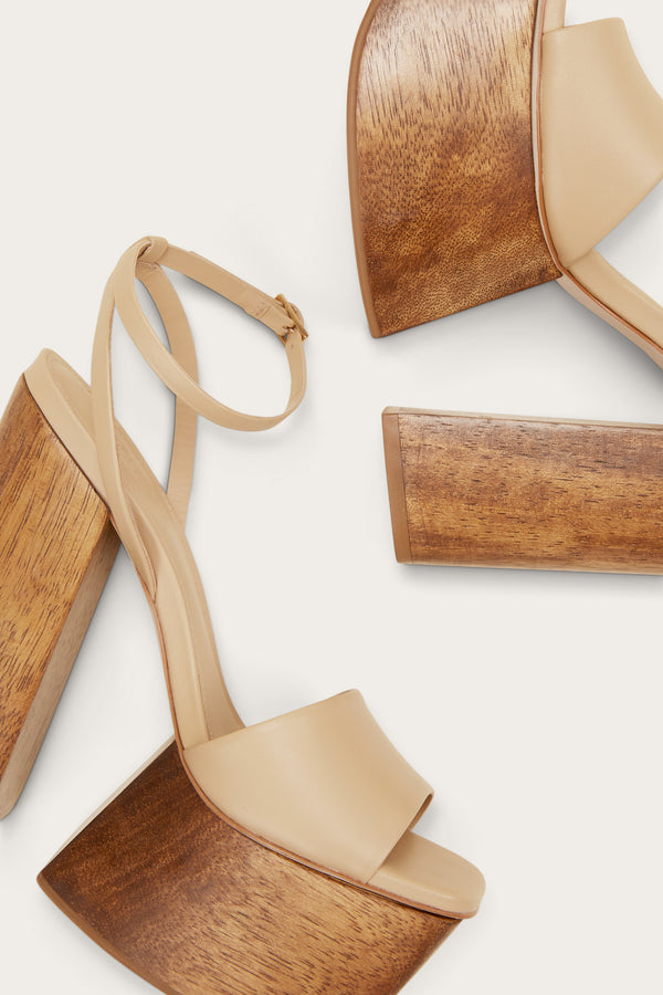 <\/b><\/span>Shauna is a stunning platform with high shine lacquered heels that is guaranteed to give your style some lift.Classic Sand-hued nappa leather straps across the foot and behind the heel compliment the natural material of the sole keep you secure. Ultra-walkable. Her angles will have all eyes on you.<\/p> True to size Heel: 5" UPPER: 100% Cow Leather SOLE: 100% Rubber HEEL: 100% Wood |
