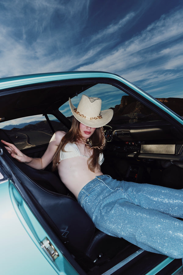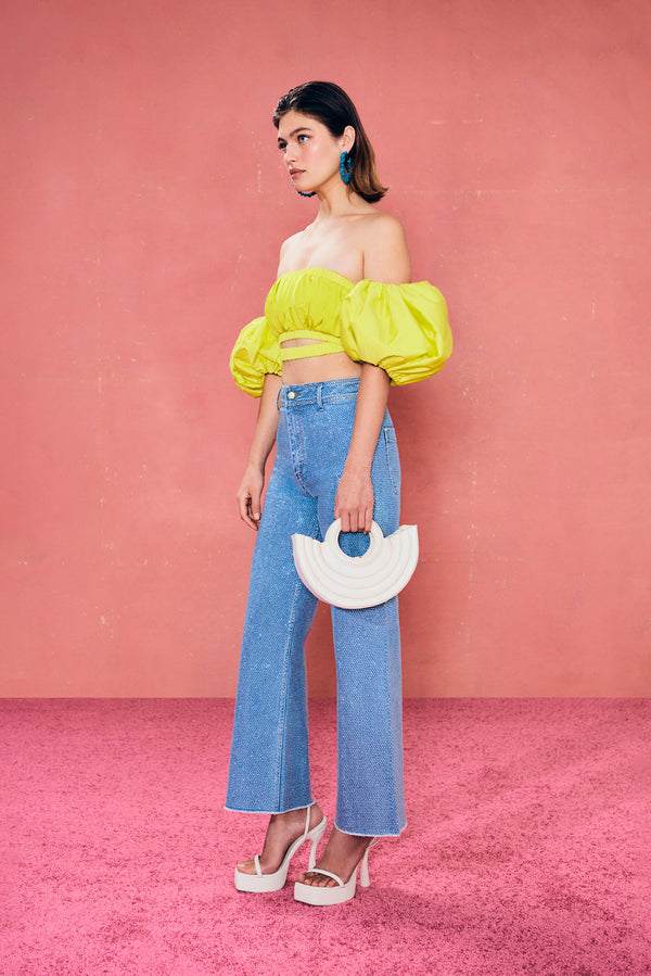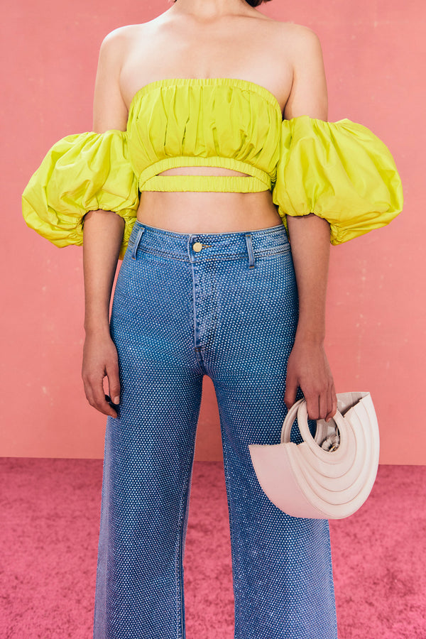<\/strong>Cult Gaia Denim is here and she's rhinestone encrusted. The Zelma Pant sparkles with a full layer of shimmering hotafix over body-skimming denim. A raw hem balances the dazzling glamour of these high-waisted wide leg pants. Features button and zipper closure with belt loops and functional back pockets. Stretch? Metallic rhinestone detailing Straight leg fit? Cropped? Raw edge? |