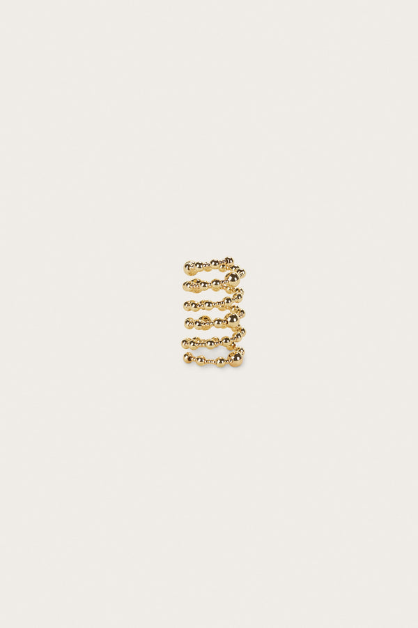 The Mishka ring adds slender elegance to your hand. This shiny, brushed brass, coiling ring is composed of different sized spheres. The space created by her wide, looping twists will span nearly the whole finger and create a slimming effect with extra shine.Fit NotesAdjustable spring Composition and Care0.60" x 2.00" 100% Brass |