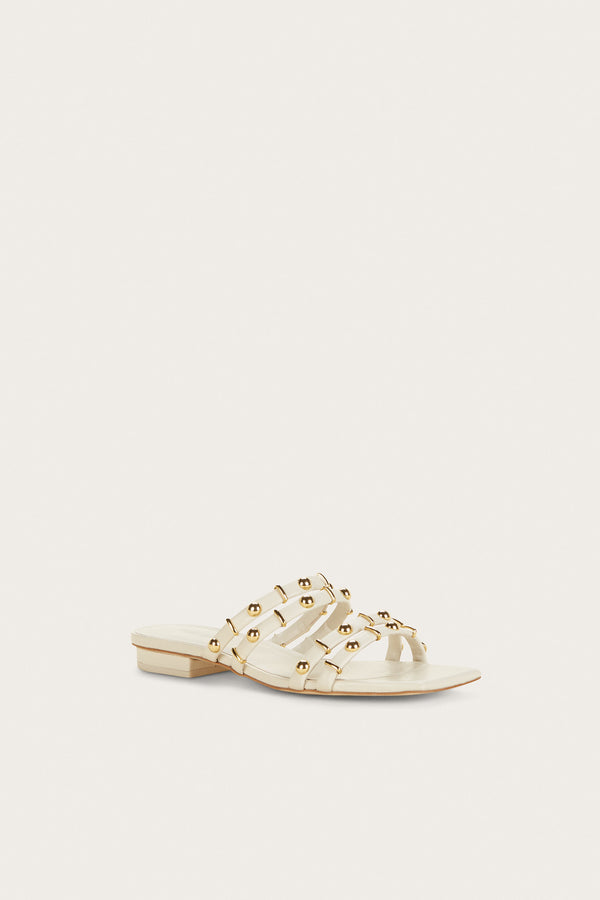 The Estelle is a slip-on sandal featuring Off-White hued leather double strapping adorned with gold-toned metal studs. The padded sole and low profile heel give you unparallelled comfort.Fit NotesComfortable fit? True to size Composition and CareHeel: 0.5"? UPPER: 100% Cow Leather SOLE: 100% Rubber HEEL: 100% ABS |