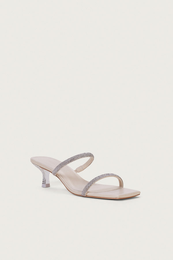 Fit NotesKitten heel Rhinestone embellishments Front straps Composition and CareHeel height: 2" Body: 60% Polyester, 40% Glass Stones Sole: 100% Rubber Heel: 50% Glass Stones, 50% ABS |