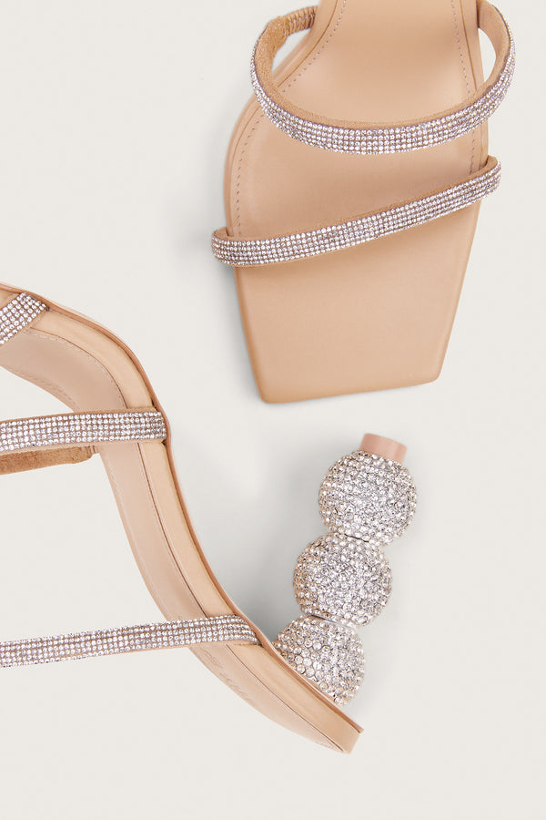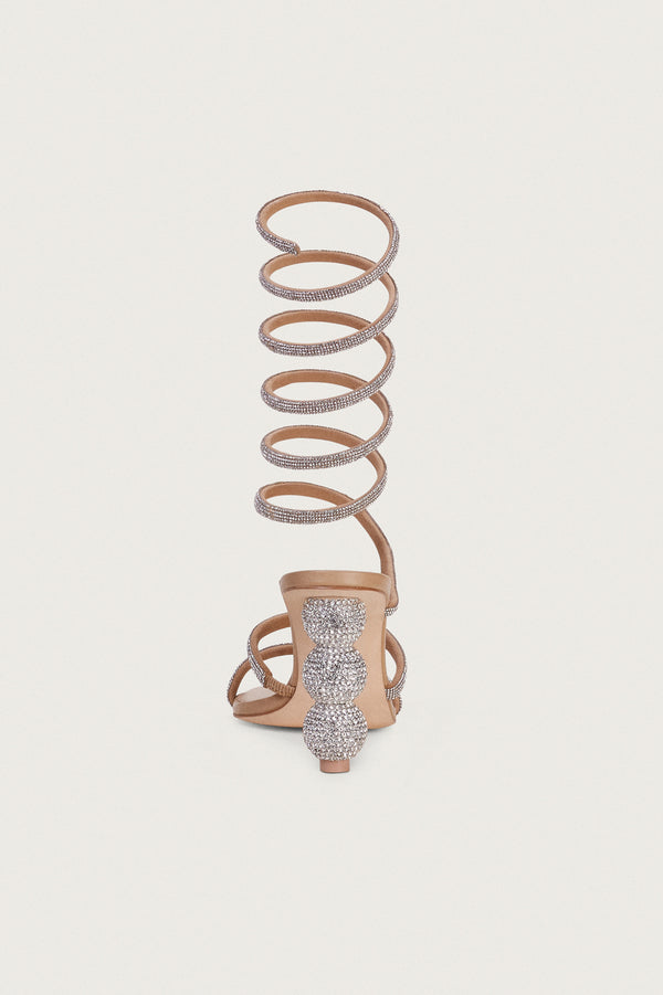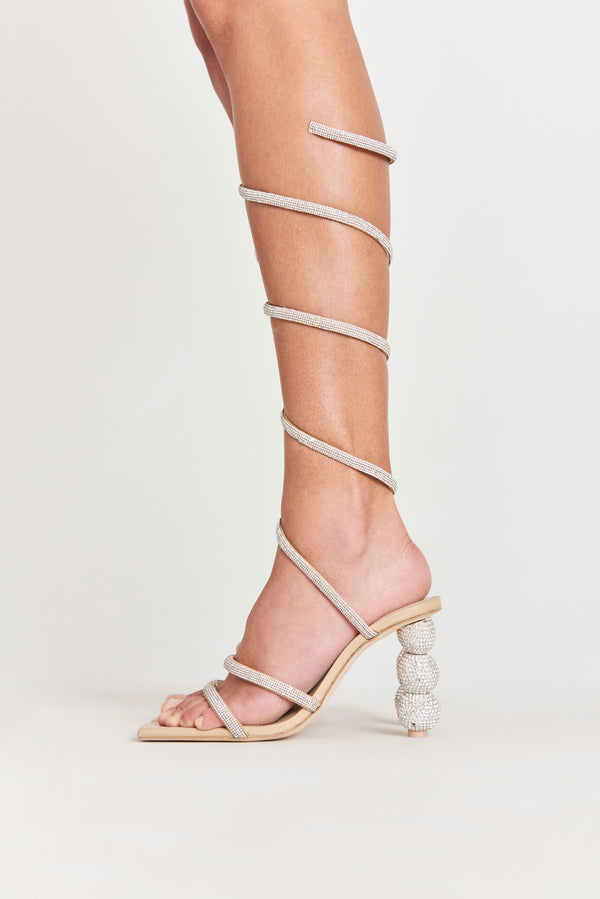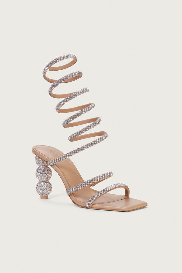 Fit NotesAdjustable spiral straps Ball heel with rhinestone embellishment Double front straps Padding at sole Composition and CareHeel height: 4" Body: 60% Polyester, 40% Glass Stones Sole: 100% Leather Heel: 50% Glass Stones, 50% ABS |