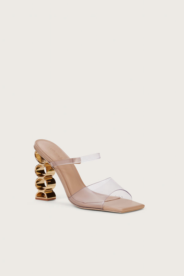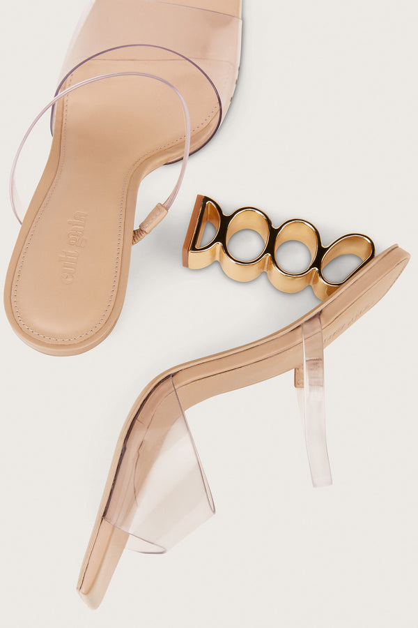 <\/strong> Fit Notes Metal stacked rings at heelPadding at SoleComfortable fit Composition and Care Heel height: 4"Body: 100% VinylSole: 100% LeatherHeel: 100% Zinc Alloy