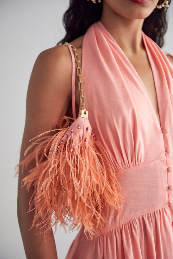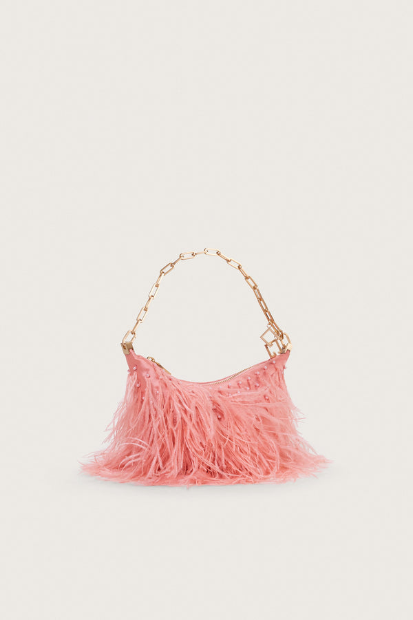 Fit NotesTop zipper closure Gold non-detachable handle strap Microsuede interior lining Satin base Fits large phone, wallet, keys, accessories Composition and Care6.5" x 9.84" Body: 100% Polyester Trim: 100% Ostrich Feather |