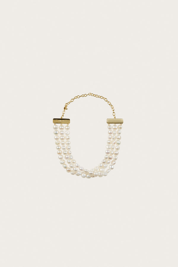 Fit Notes3 rows of Keshi pearls Lobster clasp closure Fully adjustable Fragile - do not pull Composition and CareWeight: 144 g Body: 100% Freshwater Pearls Trim: 100% Brass 15.5" x 1.5" |