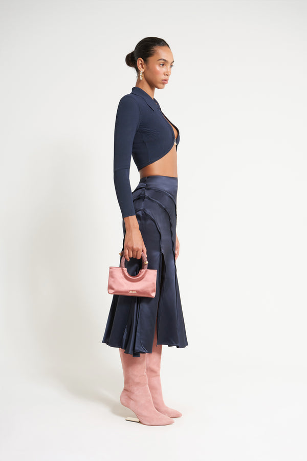 Fit NotesModel is 5'10" and is wearing a size Small Exposed seam detail throughout Side slit Unlined Invisible side zipper High waist Cut on bias Running slightly large; we recommend sizing down Composition and Care79% Naia Acetate, 21% Polyester |