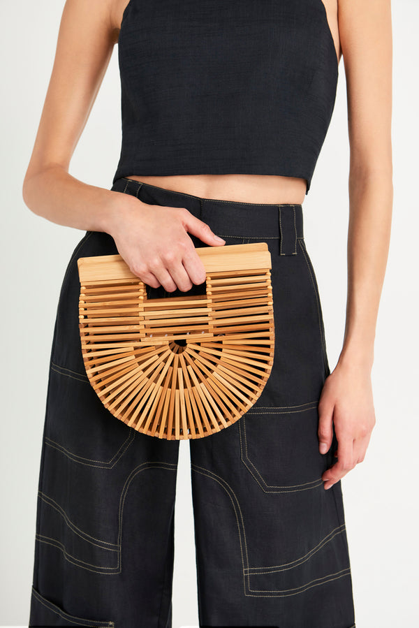 <\/strong> Fit Notes Open top with handleUnlinedCan fit phone, wallet, keys, etc. Composition and Care 9" x ?2.5" x ?8.5"?100% Bamboo