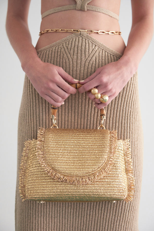 Fit NotesTop bamboo handle Magnetic front closure Lined Feet on bottom Large pocket at back Single interior compartment Composition and Care5.71" x 8.66" Body: 52% Cotton, 48% Polyamid Trim: 100% Cow Leather Lining: 90% Polyester, 10% Polyurethane |