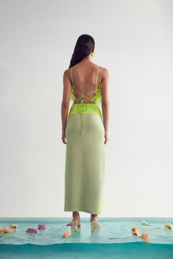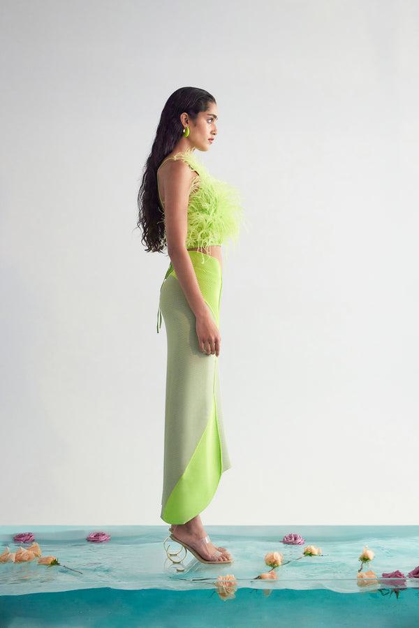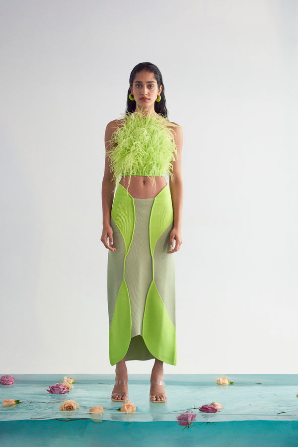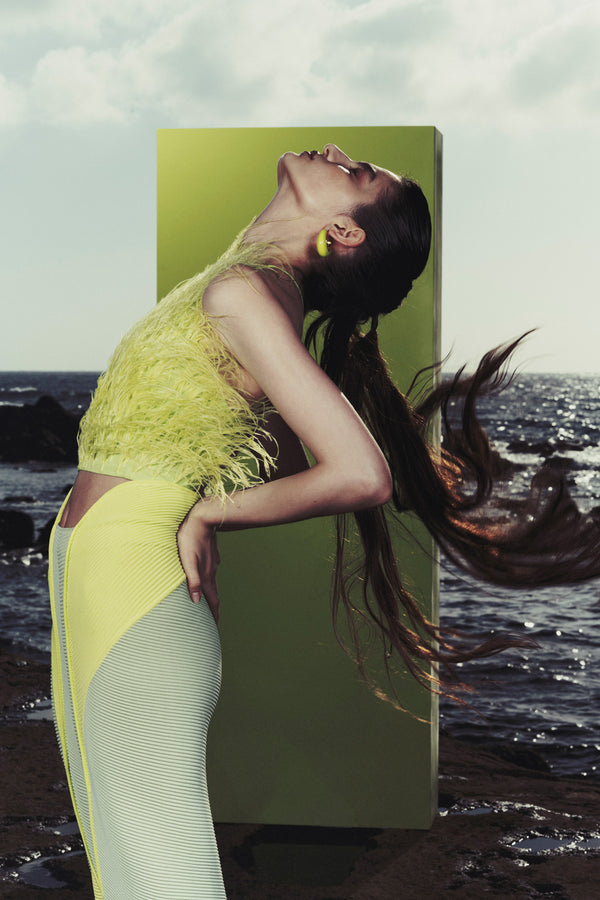 Fit NotesModel is 5'9" and is wearing a size Small Length: 14" Open back Adjustable tie straps in back Delicate ostrich feather detail Slightly cropped Composition and CareBody: 100% Viscose Trim: 100% Ostrich Feather |
