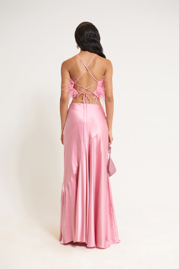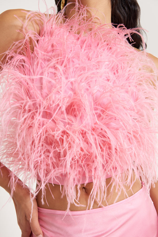 <\/strong> Fit Notes Length: 14"Open backAdjustable tie straps in backDelicate ostrich feather detailSlightly cropped Composition and Care Body: 100% ViscoseTrim: 100% Ostrich Feather