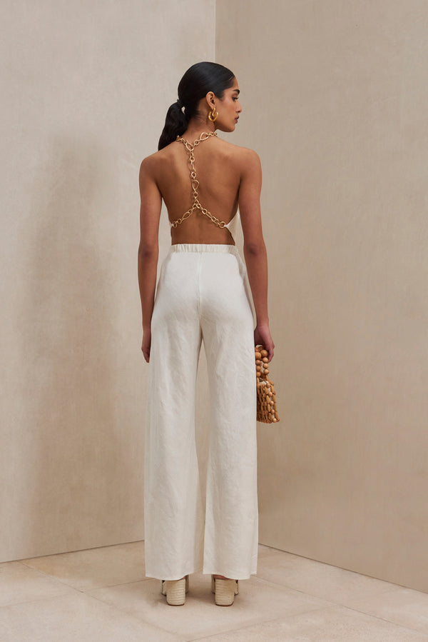 Fit NotesModel is 5'10" and is wearing a size Small Length: 14 3/4" Chain T-back straps No support Double-layered Chains are removable Larger bust size up Cropped True to size Composition and Care55% Linen, 43% Viscose, 2% Spandex |